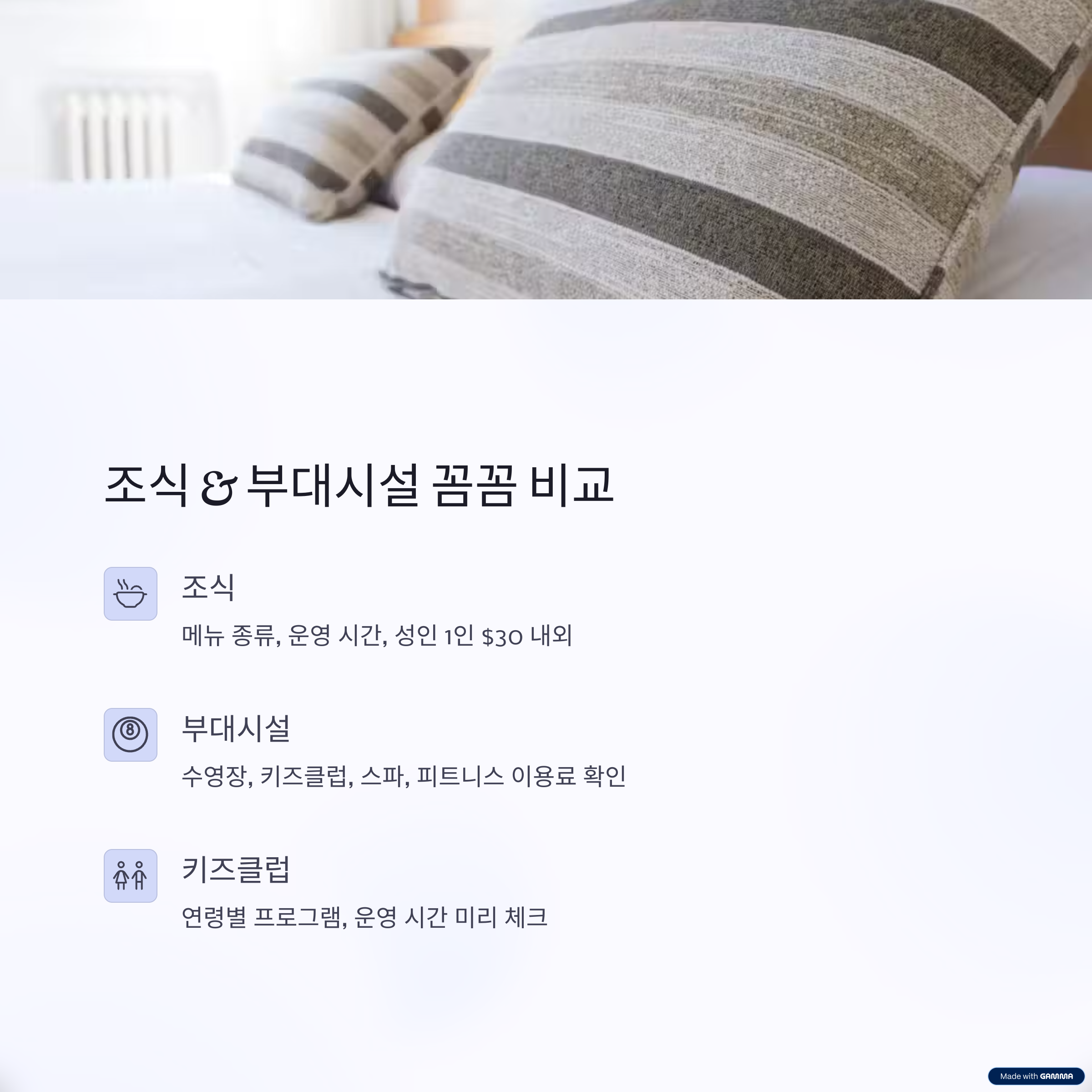 넷째, 키즈 클럽, 조식 포함 조건은 호텔마다 차이가 있으니 세부사항을 꼼꼼히 읽어야 합니다.