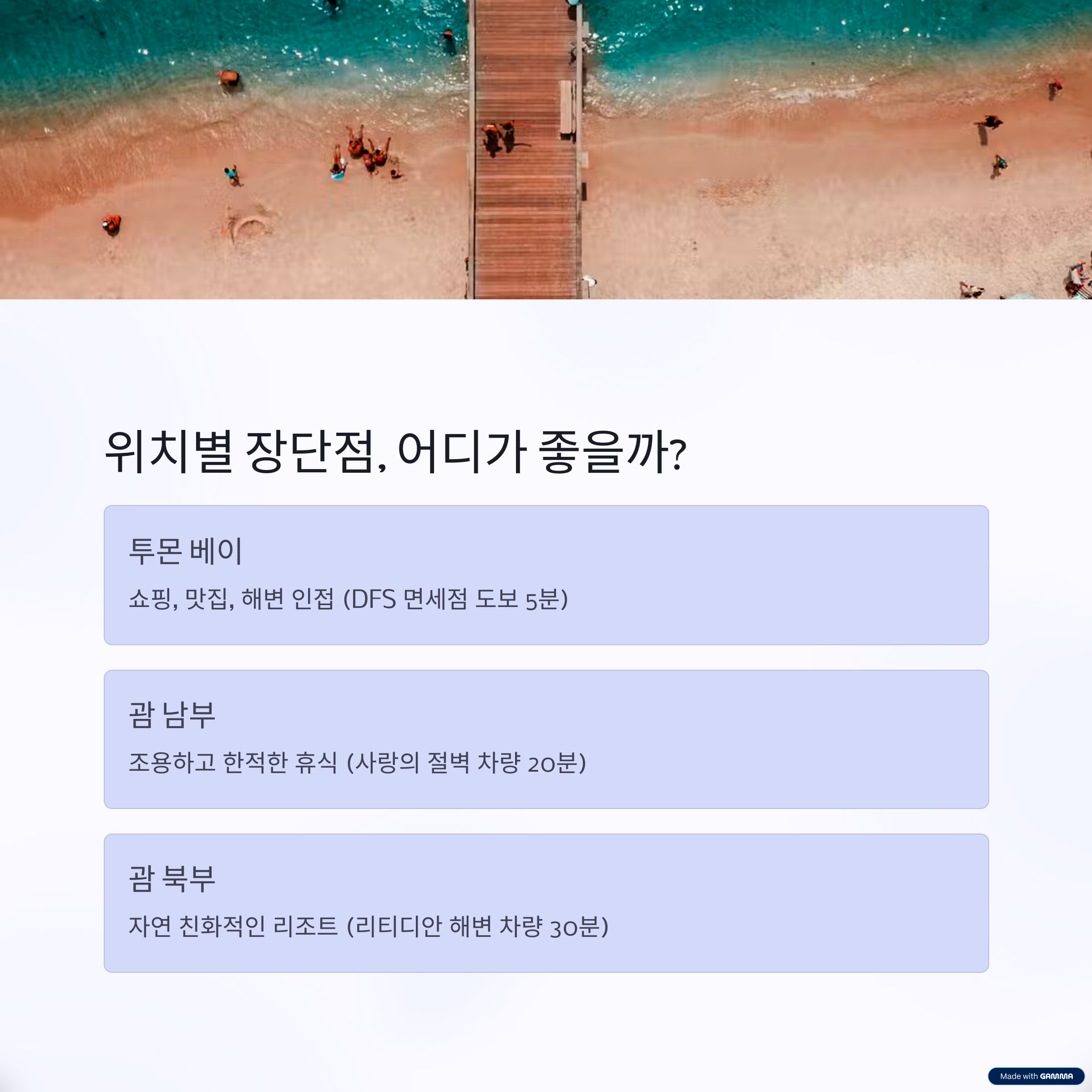 이동 시간, 주변 편의 시설, 해변 거리까지 고려해 지역을 선택하세요.