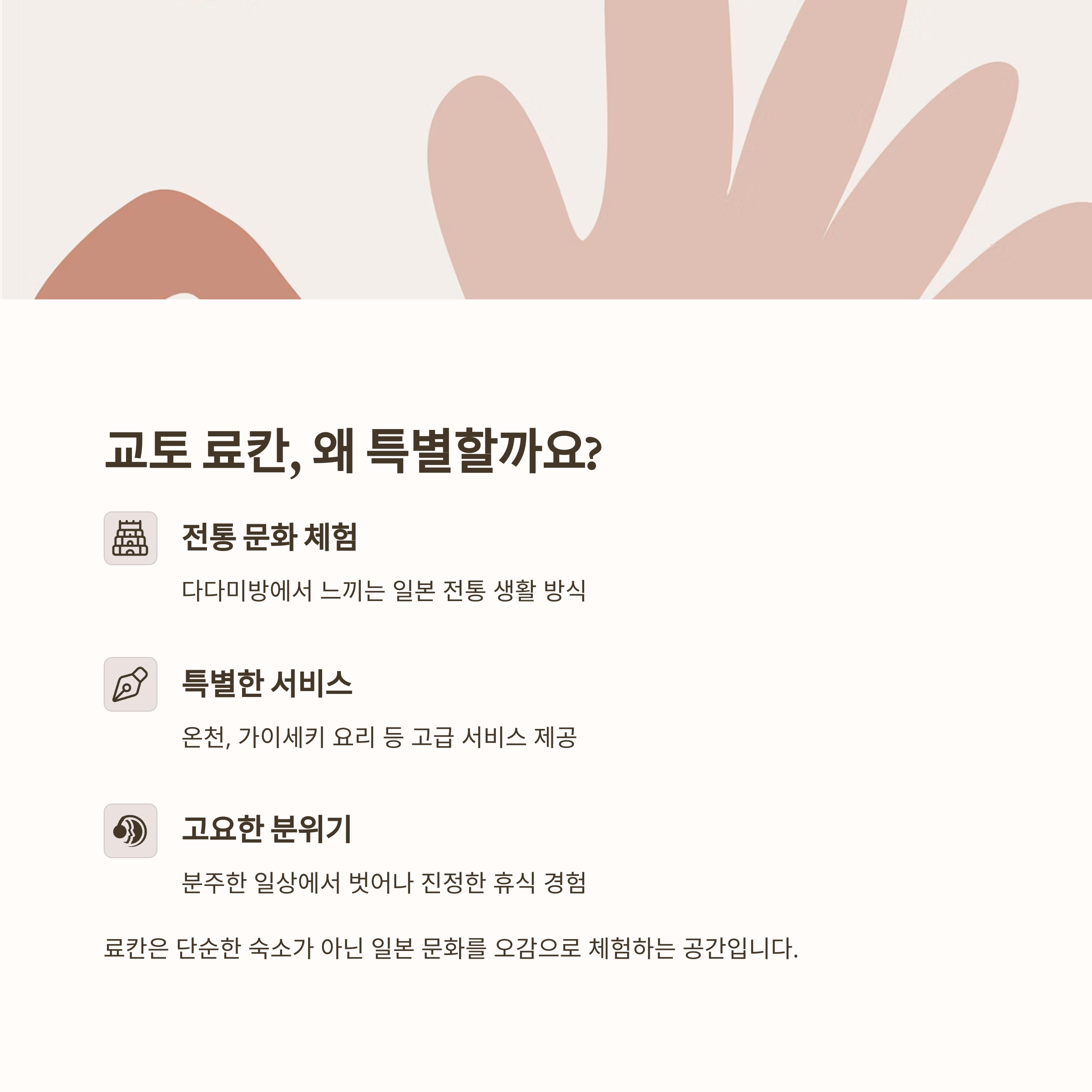 단순한 숙소가 아니라, 교토 료칸은 하나의 경험이에요.