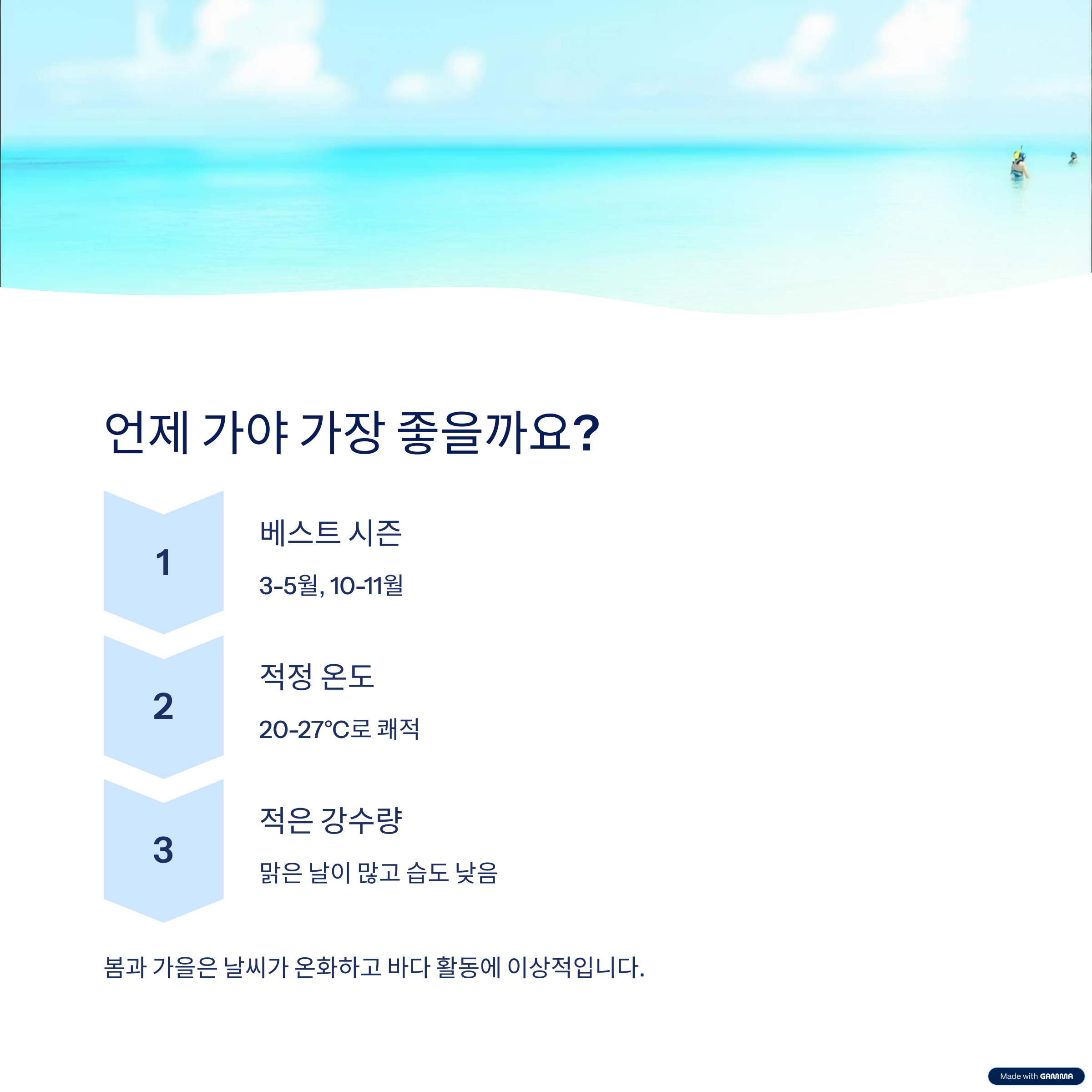 - 가을(10월~11월): 여름 끝자락처럼 따뜻하고 안정적