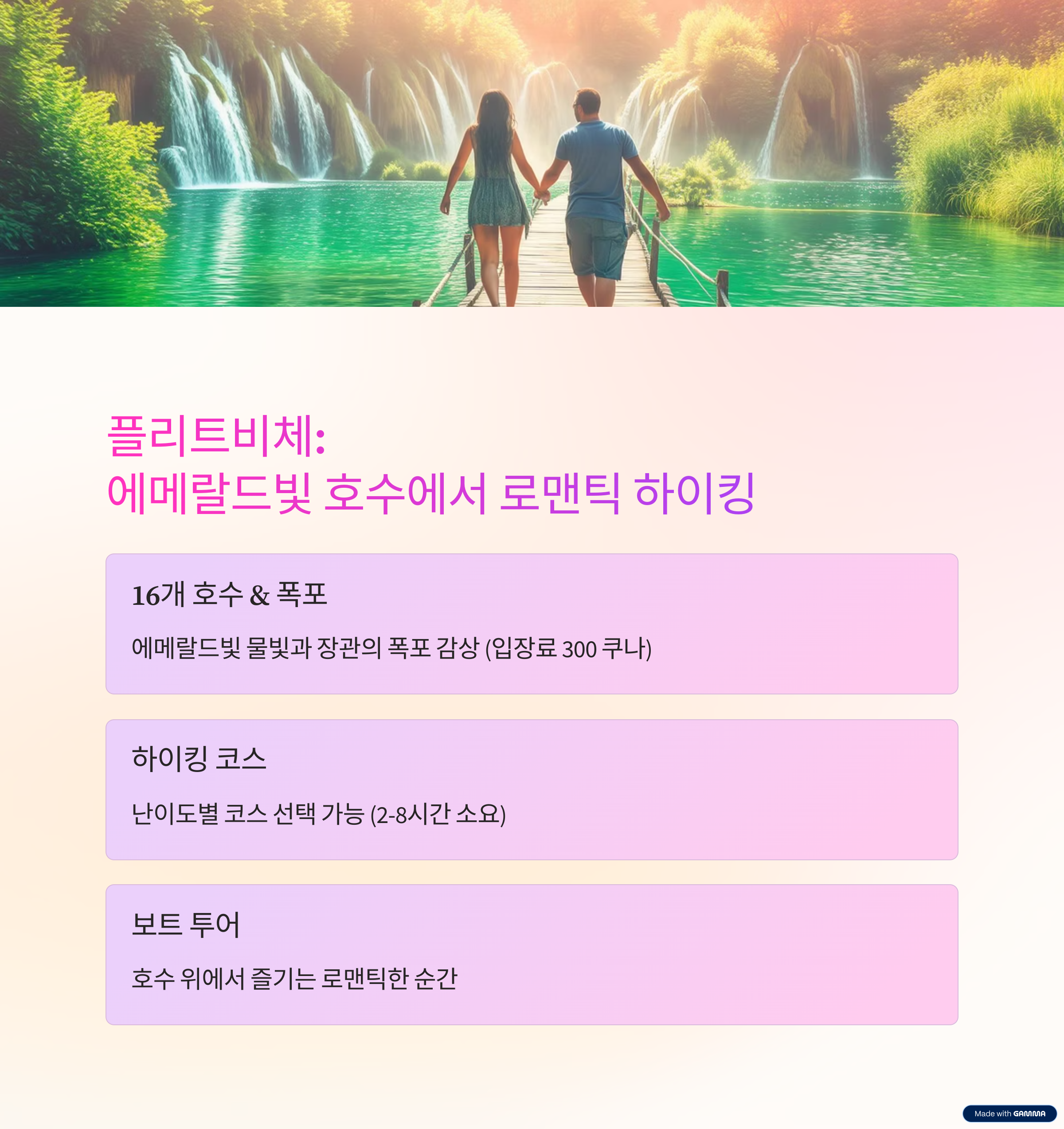 16개의 호수와 수백 개의 폭포가 이어지는 하이킹 코스예요.