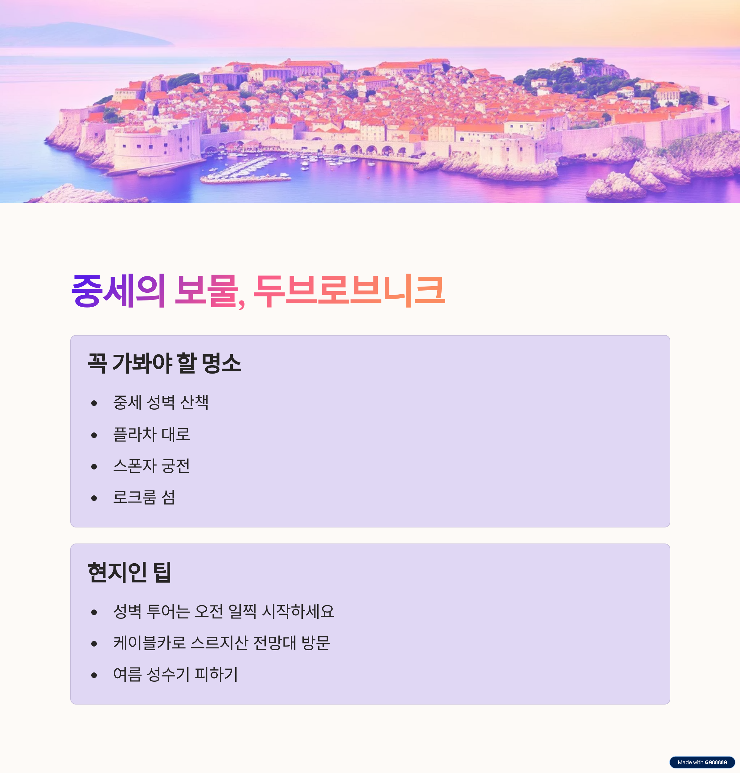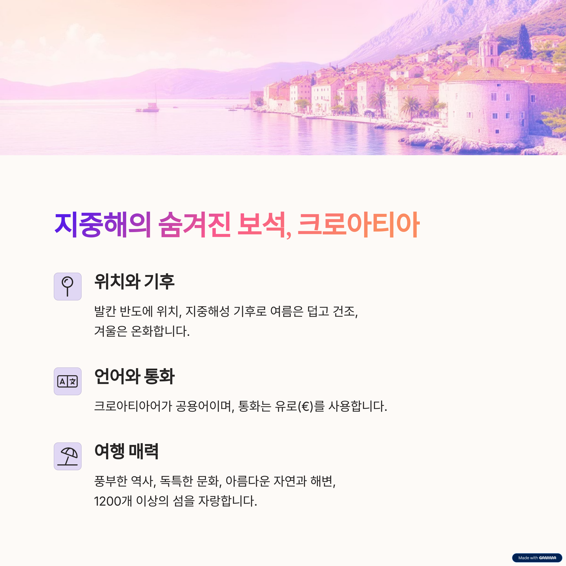 한 나라에서 문화·자연·휴양을 모두 경험할 수 있는 점이 크로아티아의 가장 큰 매력이에요.